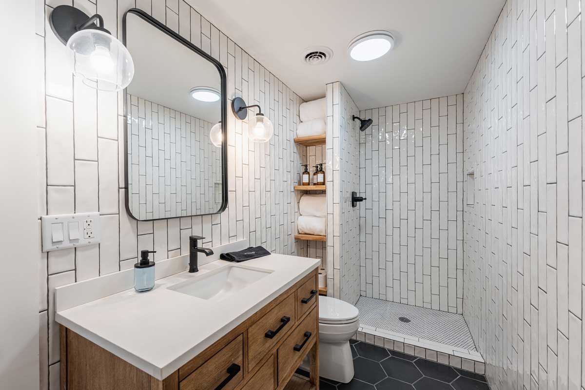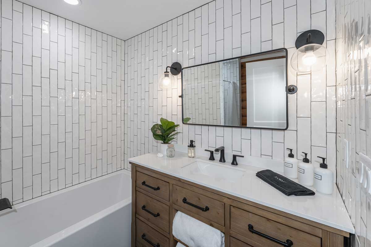 The main living floor features an open and inviting floor plan, with a well-appointed kitchen, a dining area, and a comfortable living space. The kitchen is equipped with top-of-the-line GE Cafe appliances, elegant quartz countertops, and a convenient island with seating for two.